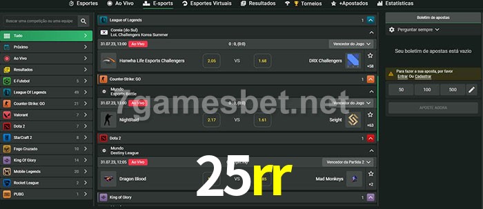 O 25rr oferece uma grande seleção de opções de apostas em e-sports com probabilidades competitivas